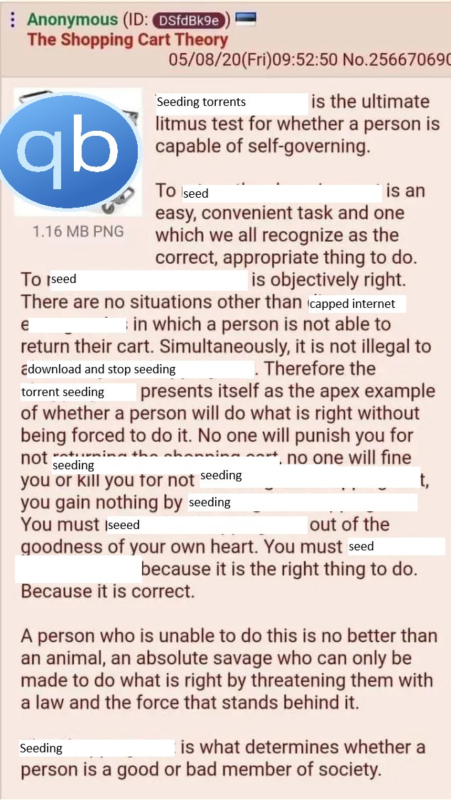 Not only do I never seed torrents, sometimes I delete the file and download it again just for fun. Even at ALDI I don't return the cart because the humiliation of whoever will is worth more to me than the quarter. When I see a wall in a public restroom that doesn't have shit smeared on it or a floor that isn't covered with piss I just see it as an opportunity, a blank canvas. A soap dispenser that hasn't had all the soap emptied all over the sink and floor, a roll of toilet paper or paper towels that isn't floating in the toilet bowl? Just another exploitable target for my amusement.